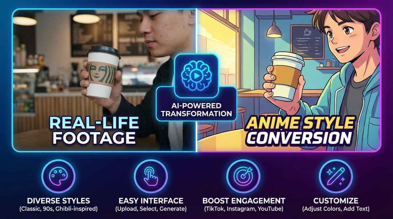 Social media demands constant anime video content. This platform helps me create cartoon-style video posts daily. Upload photos and the free generator creates anime-style videos optimized for each platform. The AI processes images quickly, delivering animated videos that boost engagement across all social channels with convert video to anime style capabilities.